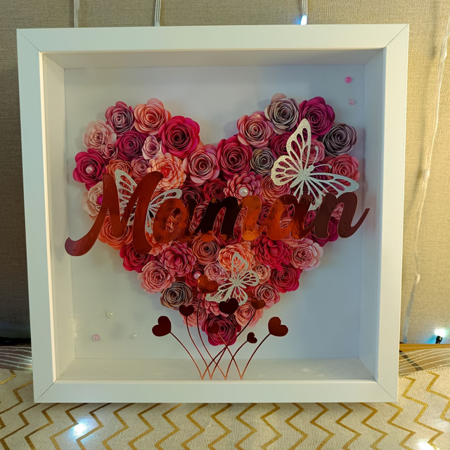 Le cœur est composé de fleurs en papier roulées, décorées de perles roses, de paillettes et de papillons assortis. Le mot « Maman » est découpé en vinyle et posé sur le plexiglas du cadre.