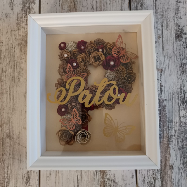 L’initiale P est composée de fleurs en papier roulées dans des tons bordeaux et kraft, décorées de perles ivoire, de paillettes et de papillons assortis. Le mot « Patou » est découpé en vinyle doré et apposé sur le plexiglas.